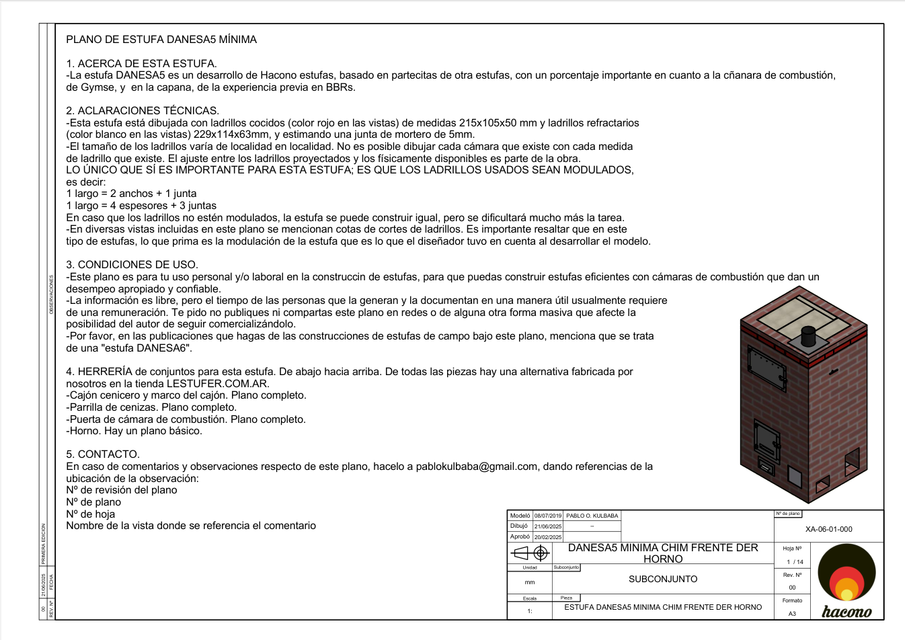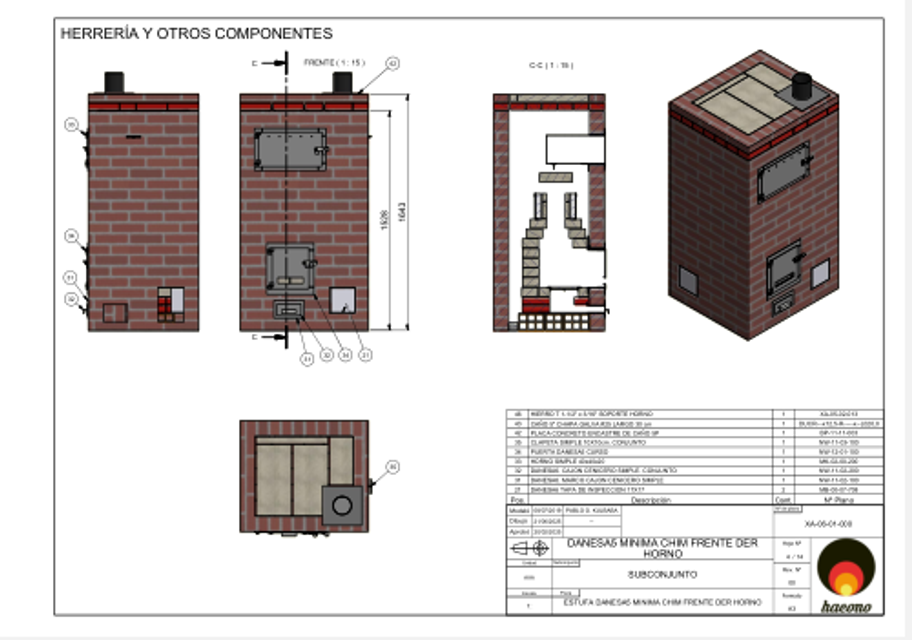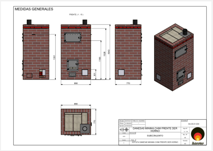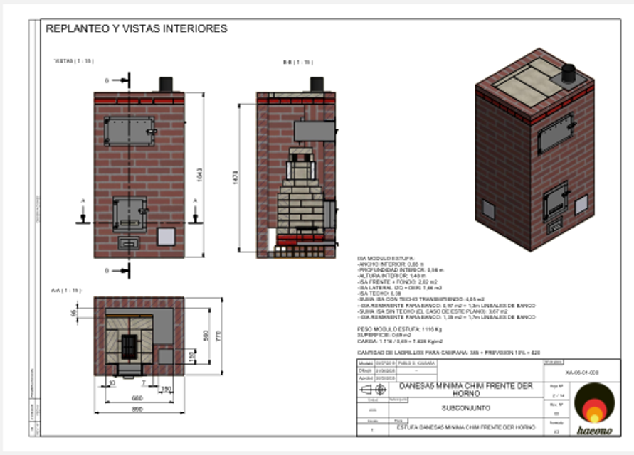 Este juego de planos está destinado a personas con formación previa en construcción de estufas a leña, estufas de masa térmica o sistemas de calefacción similares. No es un manual para principiantes. Una ejecución incorrecta puede generar fallas de funcionamiento, humo o riesgos de seguridad.El Plano PDF de estufa Danesa5 – versión de campana MÍNIMA corresponde a un diseño completo y compacto de estufa a leña de alto rendimiento, optimizado para ocupar el menor volumen posible sin resignar eficiencia térmica.