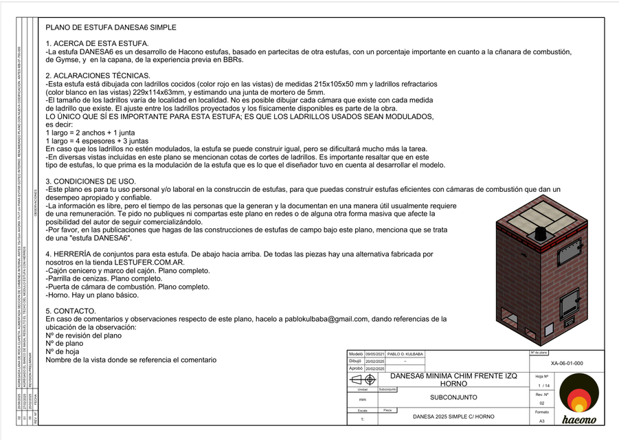 Este juego de planos está destinado a personas con formación previa en construcción de estufas a leña, estufas de masa térmica o sistemas de calefacción similares. No es un manual para principiantes. Una ejecución incorrecta puede generar fallas de funcionamiento, humo o riesgos de seguridad.